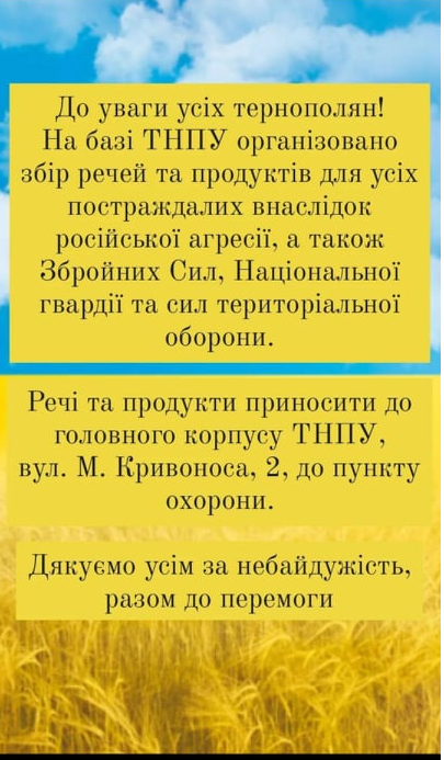 - Про волонтерський рух, який розпочинає діяти в Тернополі повідомляють місцеві мешканці в соцмережах. Уся інформація про допомгу в час війни є у нашій спільноті у Facebook Війна. Допомога Тернопіль